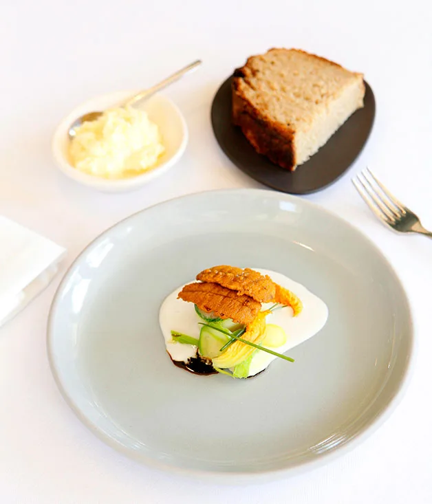 What’s not to savour in a superb dish that has a brandade of short-fin eel piped into a rolled sliver of zucchini sitting in a small pool of macadamia milk, topped with two gloriously flavoured pieces of fresh sea urchin that have been quickly seared over hot coals on the outside grill?