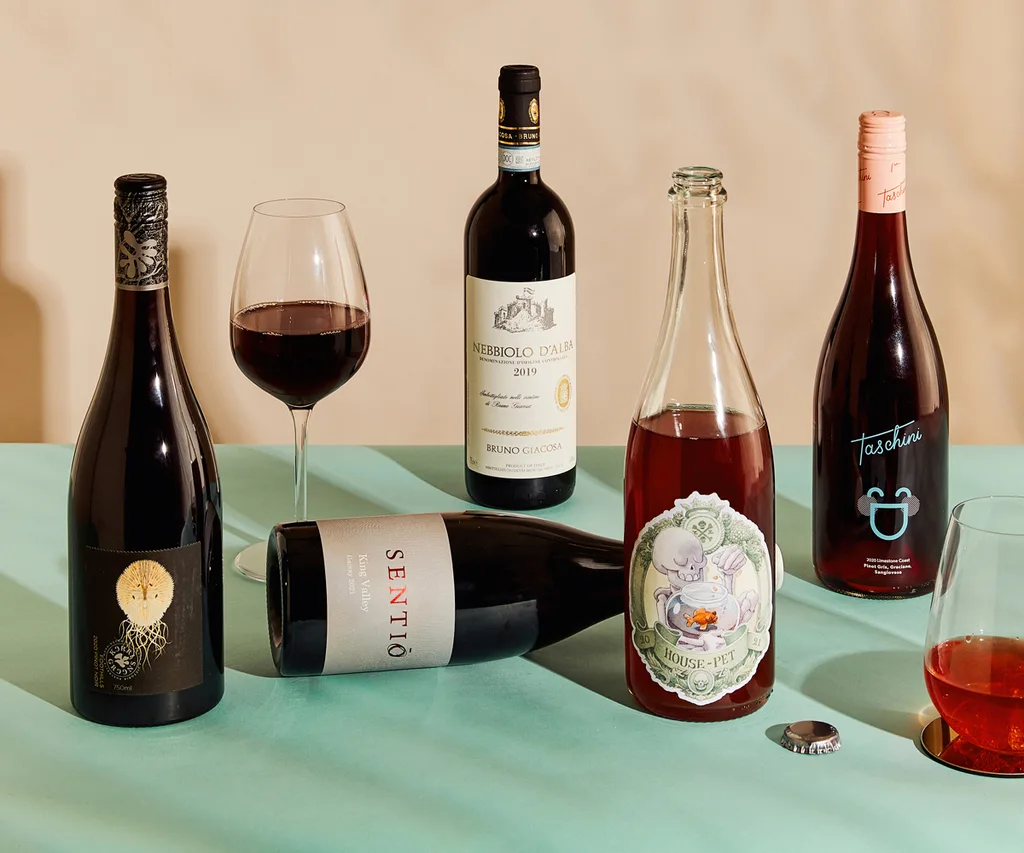 From left to right: Kerri Greens’ ‘Foothills’ Pinot Noir; Sentio’s Gamay; Bruno Giacosa’s ‘CV’ Nebbiolo d’Alba; Dormilona’s ‘House Pet’ Pét Nat; Taschini’s Pinot Gris